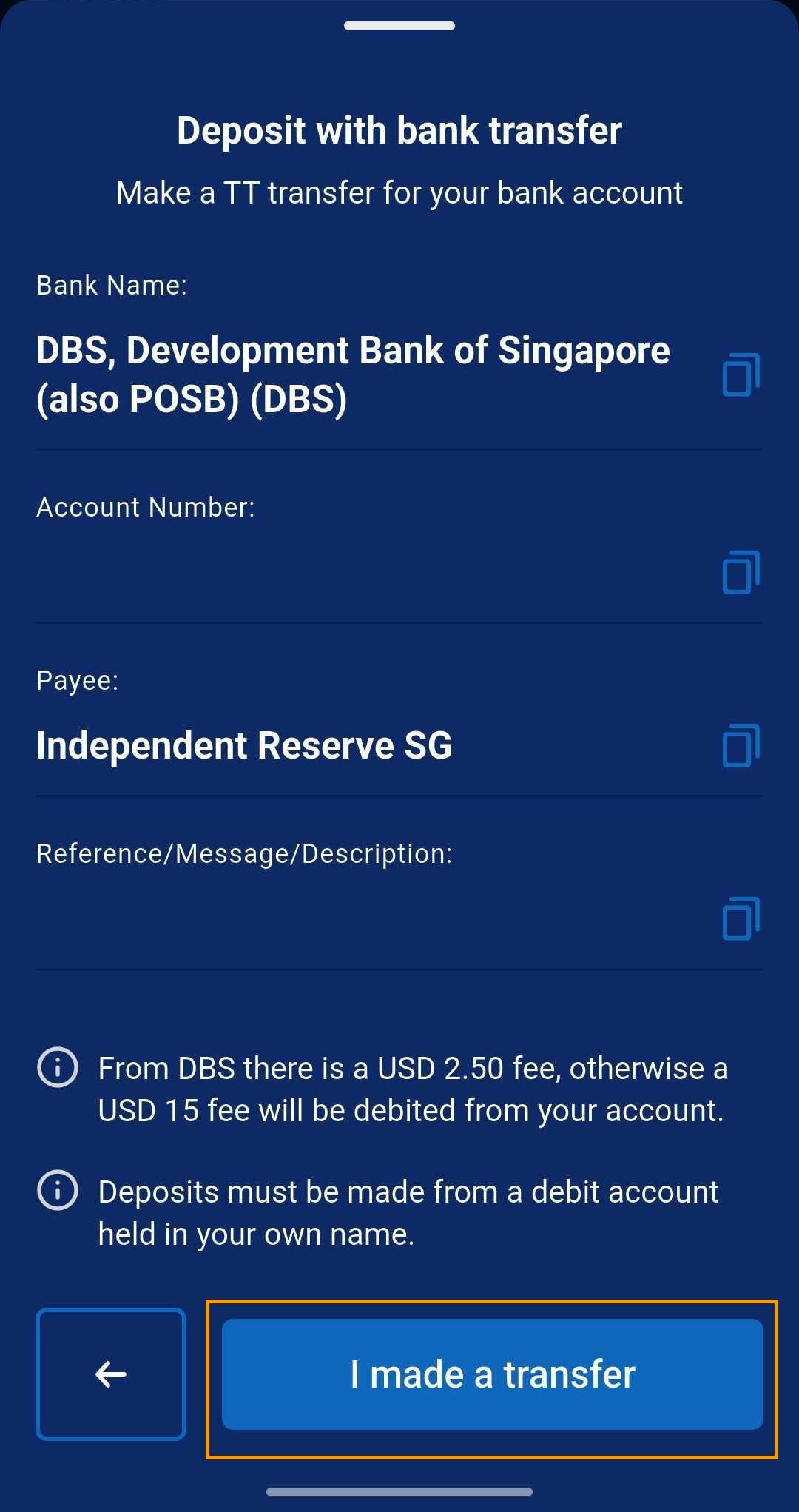 6. Make a transfer via TT or SWIFT using the above information, then return to the app and tap on ‘I made a transfer’