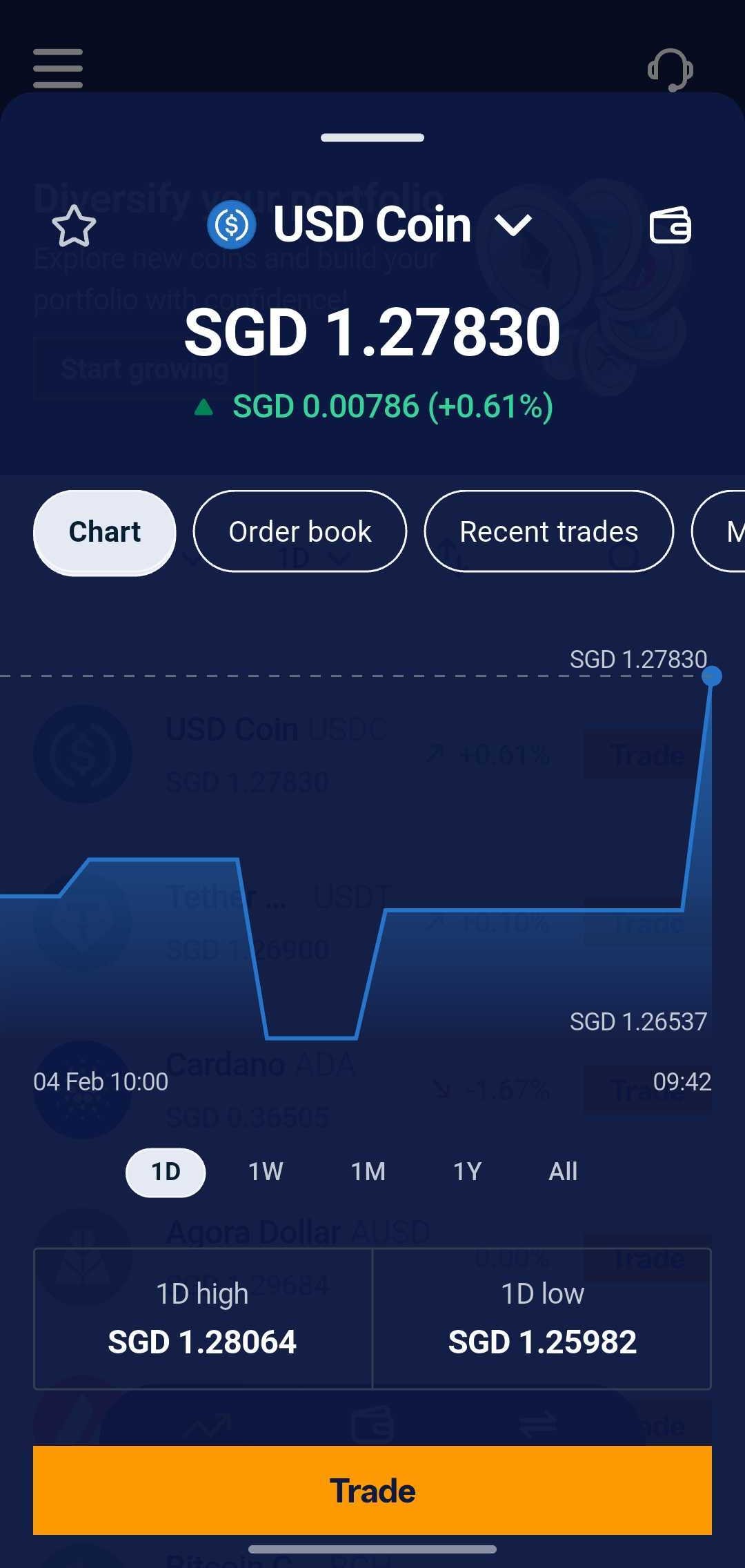3. Under the opened bottomsheet, tap Trade. This will take you to the Buy/Sell page for USDC.