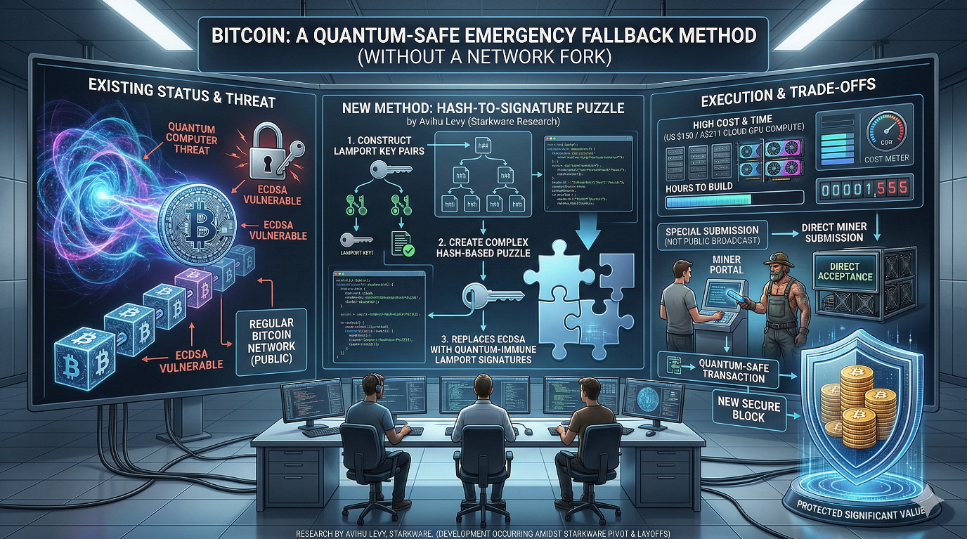 Starkware researcher Avihu Levy has published a new method to make Bitcoin transactions quantum-safe without requiring a protocol upgrade. It replaces Bitcoin’s existing ECDSA signatures with a hash-to-signature puzzle that uses Lamport signatures and is immune to quantum computers. It’s very much an emergency fallback option, however, as it costs up to US $150 (A$211) in cloud GPU compute, takes several hours to build a transaction, and the transaction must be submitted directly to a miner. But it means users can protect significant value in Bitcoin even if the community fails to upgrade it to quantum-safe in time. Starkware’s good work in this area was not enough to prevent the project from announcing layoffs today and a pivot to try to find revenue-generating products.