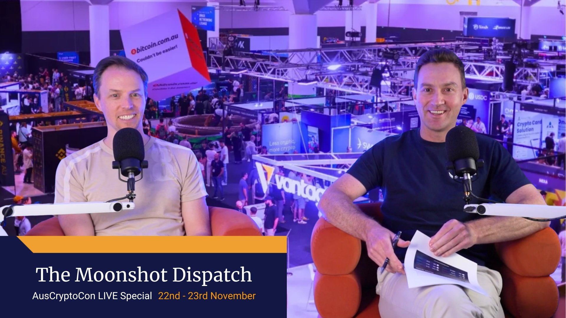 For the first time in Moonshot history, we’re taking the show on the road. Streaming live and all weekend from AusCryptoCon, Nick & Lee will host a very special edition of the Moonshot Dispatch from the Independent Reserve booth on the conference floor. From Bitcoin banter to interviewing some very special guests, you’re invited to watch the magic live in action. If you have burning blockchain questions or a hot take that needs airing, be sure to drop by the studio or tune in live to take part.